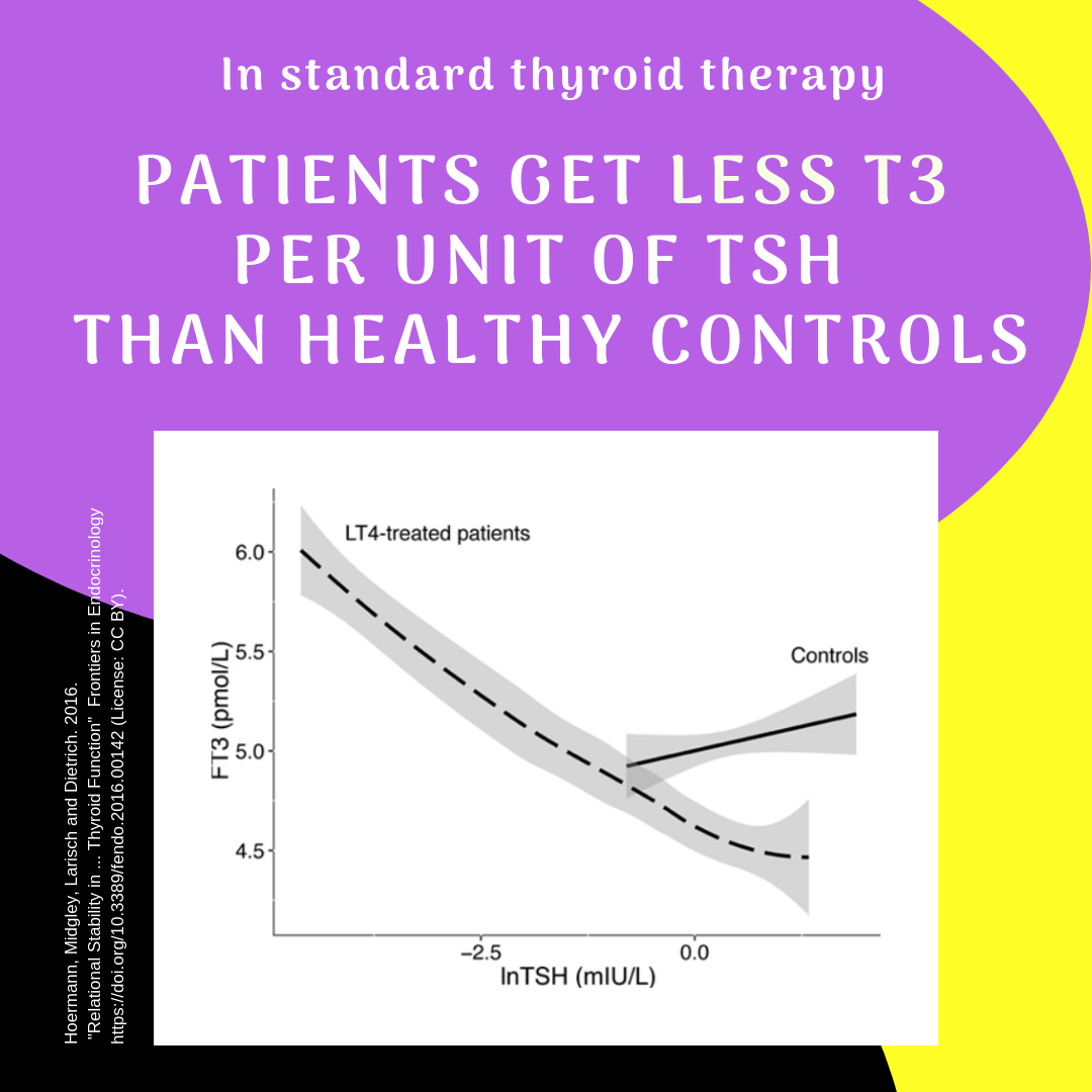 As shown in the graph by Hoermann et al, 2016a, the range of FT3 levels in thyroid therapy drops significantly lower than the norm when TSH is at 0.0 standard deviations of the norm (the healthy population average). The loss of a thyroid gland and initiation of LT4 monotherapy requires TSH to be 2.5 standard deviations below the norm to achieve an equal FT3 with the healthy-thyroid population.